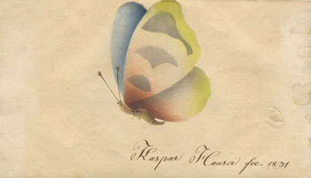 Ungeachtet der Frage ob das berühmte Kaspar Hauser tatsächlich der Erbprinz von Baden war oder nicht, er ist bis heute ein Faszinosum geblieben. Es wird nicht ernsthaft angezweifelt, dass Hauser weitestgehend isoliert von menschlicher Gemeinschaft und ohne äußere Reize die größte Zeit seiner Kindheit verbrachte. Vollkommen depriviert wurde er 1828 in die Gesellschaft entlassen. Die Beobachtungen Dritter und auch spätere Selbstzeugnisse belegen seine Probleme, der Realität zu begegnen. Die Hypersensitivität Hausers, der zudem auch anfangs nicht zwischen belebten Wesen und unbelebten Dingen zu unterscheiden wusste, nahm in dem Maß ab in dem er in die Gesellschaft integriert wurde. Zu seiner Ausbildung gehörte auch Aquarell- und Zeichenunterricht, den er vor allem dazu nutzte, Früchte- und Blumenstillleben anzufertigen, die er als Geschenke weiterreichte. Diese „disziplinierten“ Blätter stehen im direkten Gegensatz zu dem intimen Medium Zeichnung, das ihm die Möglichkeit des expressiven Ausdrucks hätte geben können.